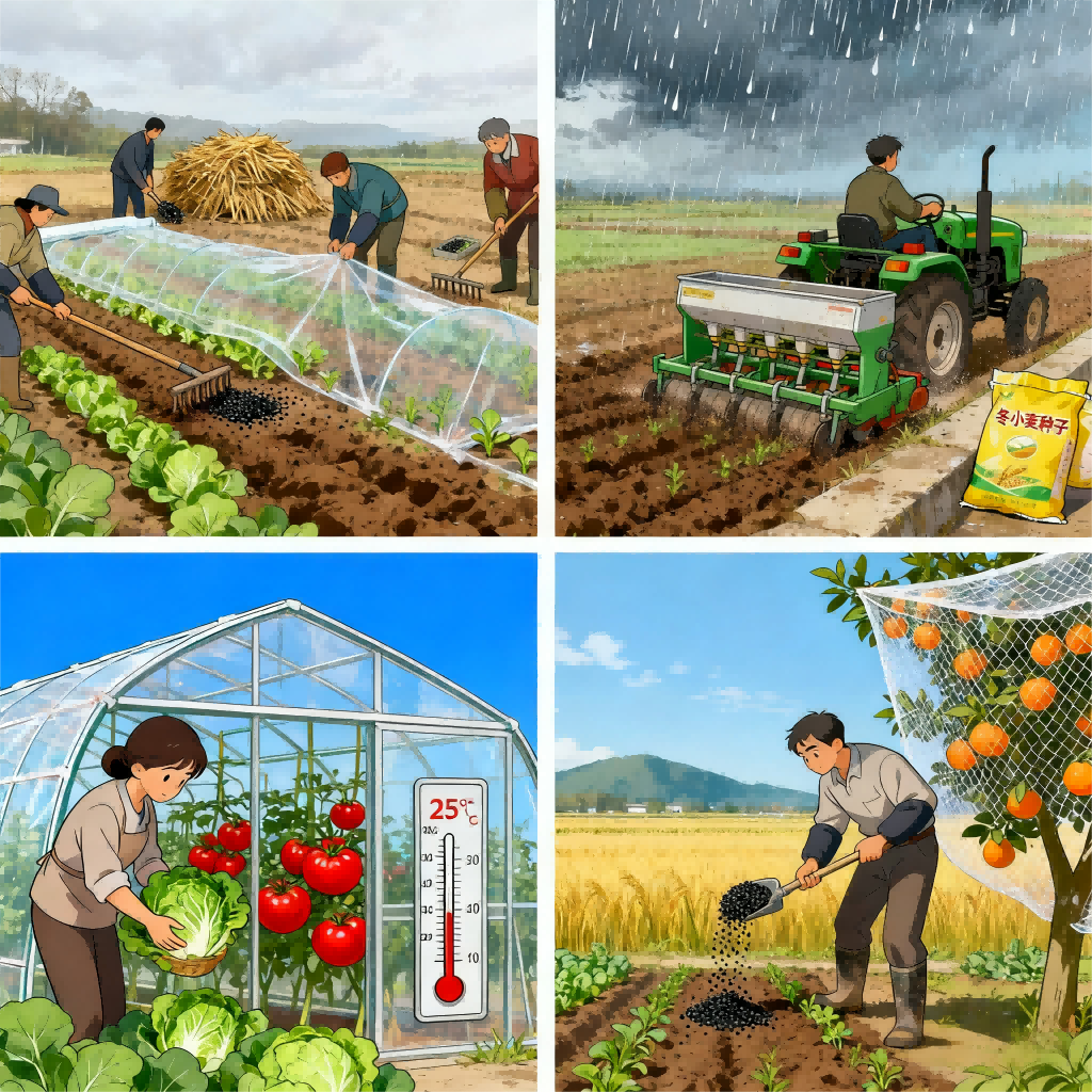 稻田与果园养护:晚稻收割后的稻田及时翻耕晒垡,或种植紫云英等绿肥作物改良土壤;柑橘园里,果实尚未采收的果树需搭建防风障,避免寒潮冻伤果实,同时追施少量有机肥,增强树体抗寒能力。