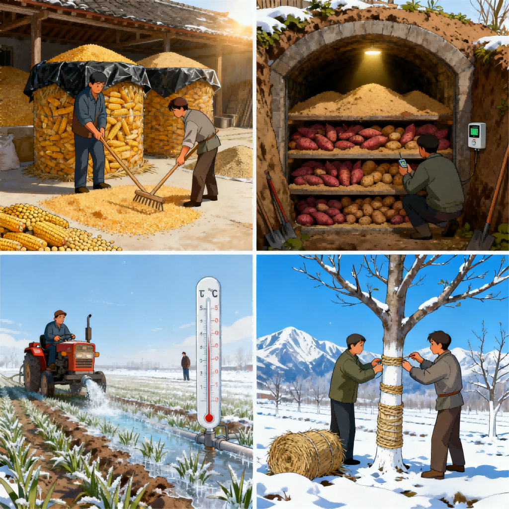 传统防护巧发力:秸秆覆田既能为冬小麦、油菜苗保温保墒,又能改善土壤;寒潮来临时,田间堆起杂草、谷壳点燃熏烟,利用烟雾提升小环境温度 2-3℃,减轻冻害;地窖储藏、树干缠草绳等方法,依旧是农户应对严寒的 “基础操作”。